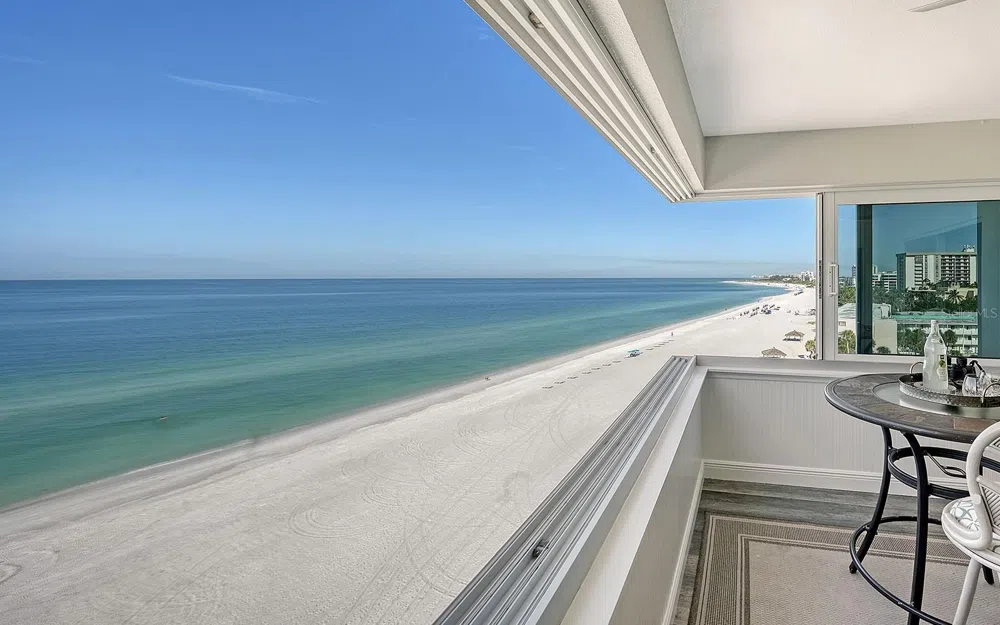 Enjoy the beach life from this eighth-floor, Gulf front condominium on Lido Key in Sarasota, Florida. Nestled between the Gulf of Mexico and Sarasota Bay, Lido Regency claims a prime piece of waterfront on south Lido Key where coastal living is on island time. Uncrowded. Pristine. Relaxed. Unwind on the beach, or walk to Ted Sperling Park and paddle through its beautiful mangrove tunnels to Sarasota Bay. This rarely available corner residence has Gulf views from every room, including a Florida room with wrap-around, wall-to-wall windows — the sunsets are spectacular! From here, you can see all the way from Siesta Key to Longboat Key, plus you can look to the east and see Sarasota Bay and the Ringling Bridge. The corner-less windows create a dual-purpose room — a full-open balcony or an enclosed Florida room. The floorplan features two bedrooms, two baths, a Florida room, and an open kitchen/great room/dining living area. The kitchen has an eat-in counter with extra storage, stainless steel appliances, and a tray ceiling. A shared utility room on the floor has an assigned storage locker, as well as a washer and dryer. The condominium comes furnished. The first-floor community space features floor-to-ceiling windows in the lobby, a fitness gym, and a social room. First-floor amenities also include shower/changing rooms, outdoor grills, and kayak/paddleboard storage. The beachside pool area features a heated pool/spa along with pool furniture. Lido Regency is a condominium with an active social lifestyle. This peaceful retreat is the perfect spot to unwind and relax by the beach. You can literally roll out of bed, ride down the elevator, and step out onto the powdery white sands of Lido Beach. The beach life, resort life and city life unite here. On one side you have a private, gated pool by the beach. On the other, it’s just one mile to the shops and restaurants of St. Armands Circle, and only four miles over the Ringling Bridge to Downtown Sarasota for more shops and restaurants, plus art galleries, farmers market, and performing arts. Free Bay Runner trolley from South Lido to St. Armands and Downtown. Life is good on the beach!