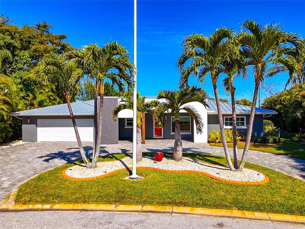 Enjoy life to the fullest in this 3 bedroom, 3 bath mid-century modern style ranch home, nestled on a near 1/3 acre lot in the sought-after South Gate neighborhood, offering over 2,400 square feet of architecturally updated and meticulously maintained living space. From the moment you arrive, this private sanctuary impresses with iconic palm trees, a custom circular paver driveway, professionally lit landscaping, and a vivid one-of-a-kind patio with a colorful front entry. Inside, the light and bright open-concept floorplan showcases flawless terrazzo flooring and a striking modern contrasted kitchen with stainless steel appliances and a large island with bar-top seating. The kitchen and living areas flow seamlessly into the family and dining room, providing ample gathering space and an entertainment center ready for modern electronics. French doors lead to an almost 40-foot screened lanai overlooking a professionally manicured, fenced, and irrigated backyard accented with coping. The primary bedroom features a private exterior entrance, space for a desk or seating area, and an en-suite bath with a walk-in closet with built-in shelving and safe, a wall-to-wall glass shower with multiple massage jets and bench seating, and a separate water closet. Two additional contemporary bedrooms and bathrooms are located on the opposite side of the home. The remodeled two-car garage is climate controlled and includes a full laundry room with utility sink. Major upgrades and systems include a standing seam metal roof, hurricane-rated impact windows and garage door, tankless water heater, whole-home generator, updated electrical system with new controls, and a plumbing system rerouted with exterior clean-outs for easy access. The home includes both a 100-gallon and 500-gallon propane tank, with the generator operating from the 500-gallon tank and the water heater capable of running from either tank, all serviced on a regular basis. Indoor comfort is enhanced by a professionally maintained HVAC system with in-duct air purification, including UV lighting and a whole-home purification system. Smart-home features allow remote control of the irrigation system, HVAC, alarm system, front door lock, and security cameras. The driveway has been recently resealed, and exterior security lighting surrounds the home. Optional membership to the South Gate Community Association offers social activities and pool access at the historic community center for a nominal fee. Ideally located just minutes to golf courses, boat clubs, Downtown Sarasota dining, shopping, nightlife, cultural events, and the world-famous beaches of Siesta Key.